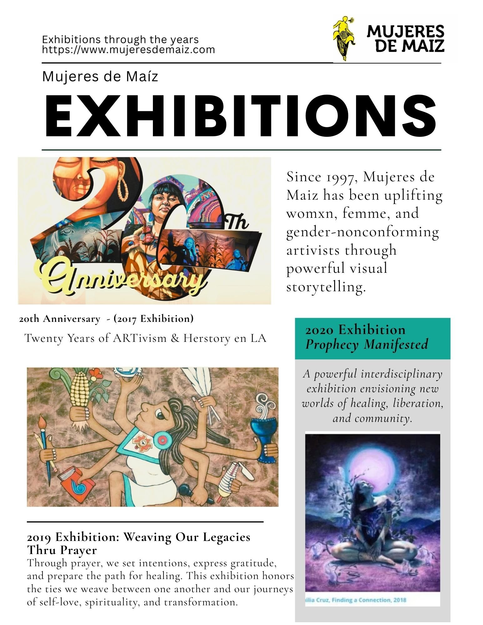 Mujeres de Maiz started creating pop up exhibitions in 1997, since then our one day pop up art shows featuring all womxn, femme and gender non conforming artivists have transformed to month long exhibitions featuring intergenerational, intercultural holistic artivists from beginning, established and veteran artists.