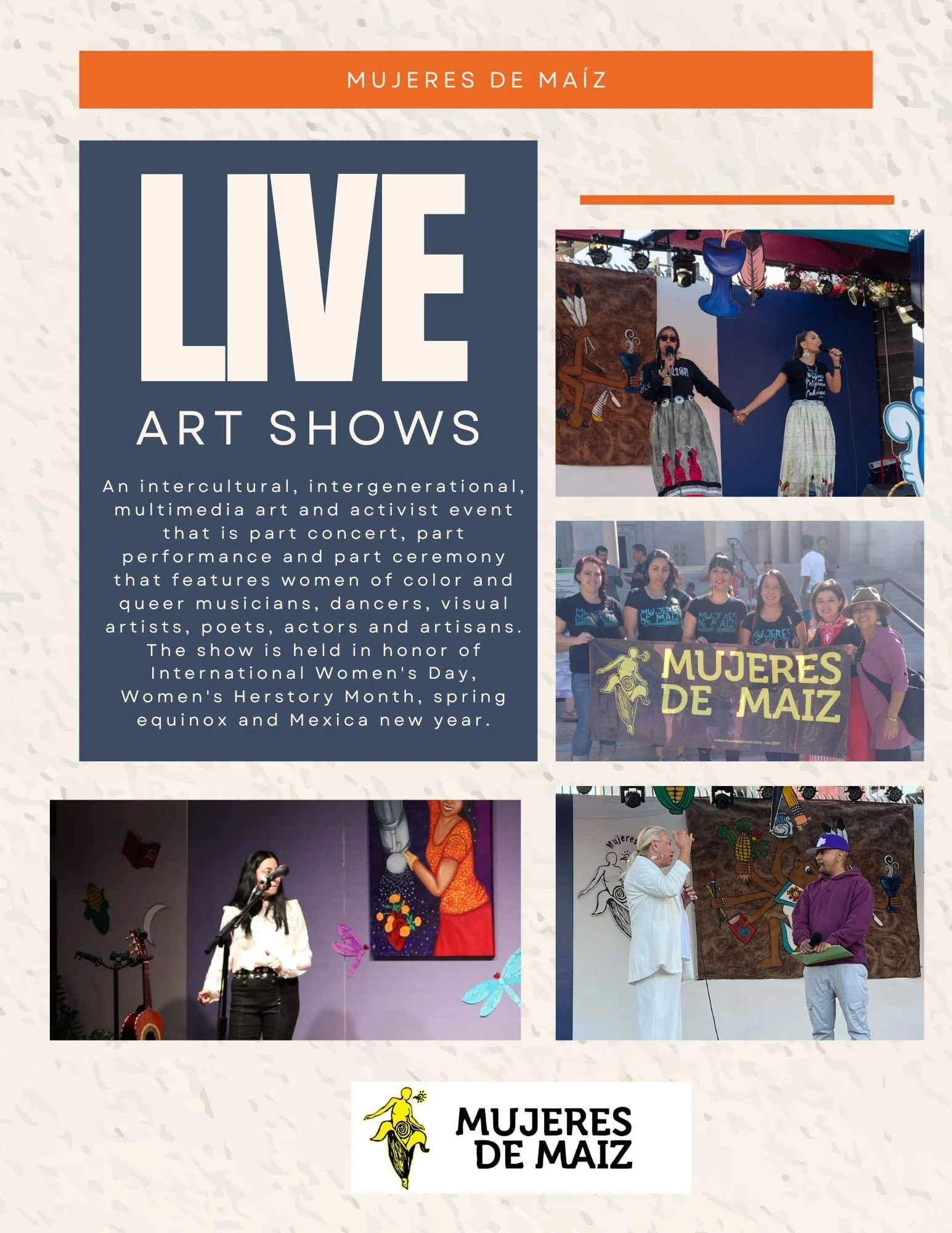 An intercultural, intergenerational, multimedia art and activist event that is part concert, part performance and part ceremony that features women of color and queer musicians, dancers, visual artists, poets, actors and artisans. The show is held in honor of International Women's Day, Women's Herstory Month, spring equinox and Mexica new year.
